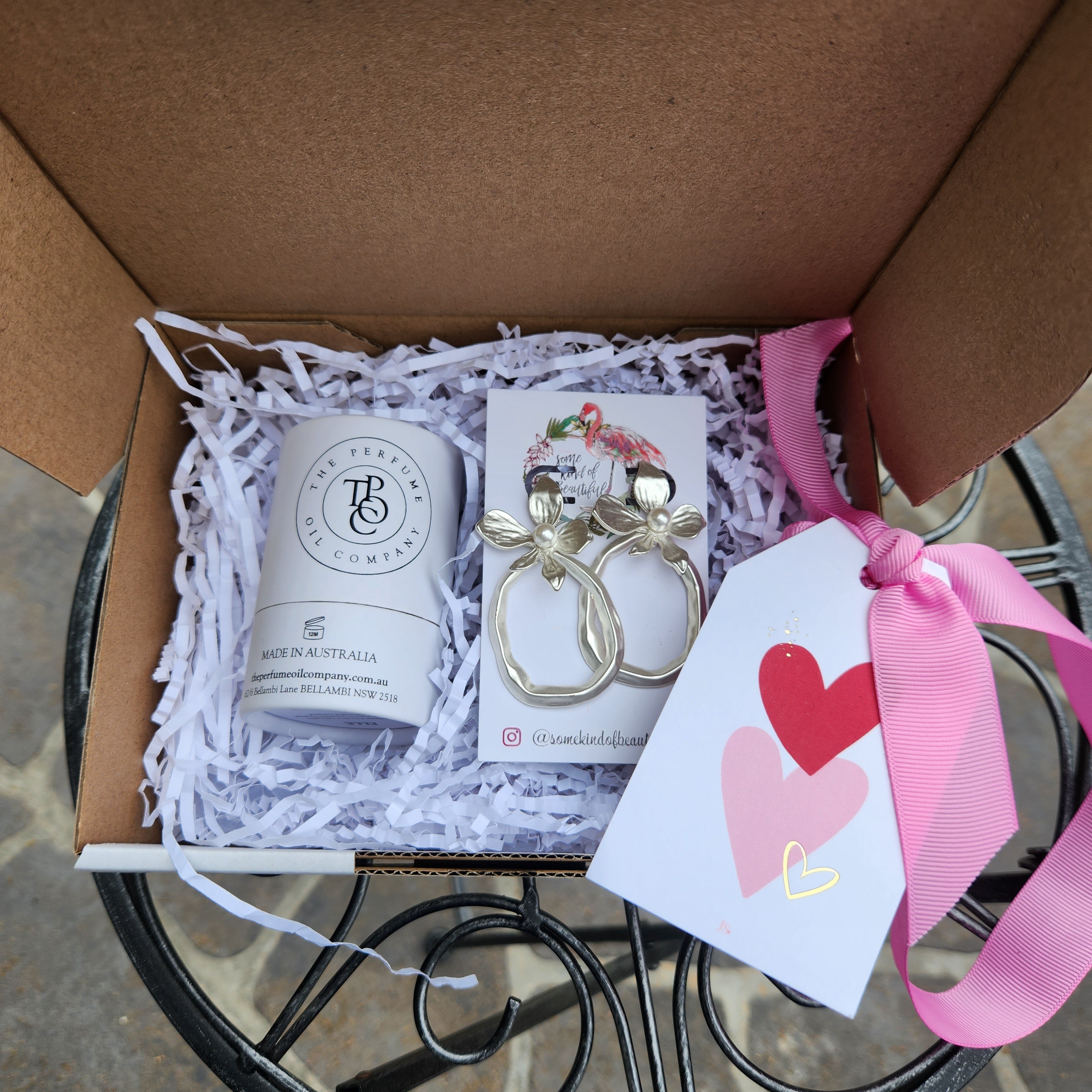 Contains a pair of earrings from our artisan jewellery range and a perfume oil from The Perfume Oil Company (fragrance Elle)