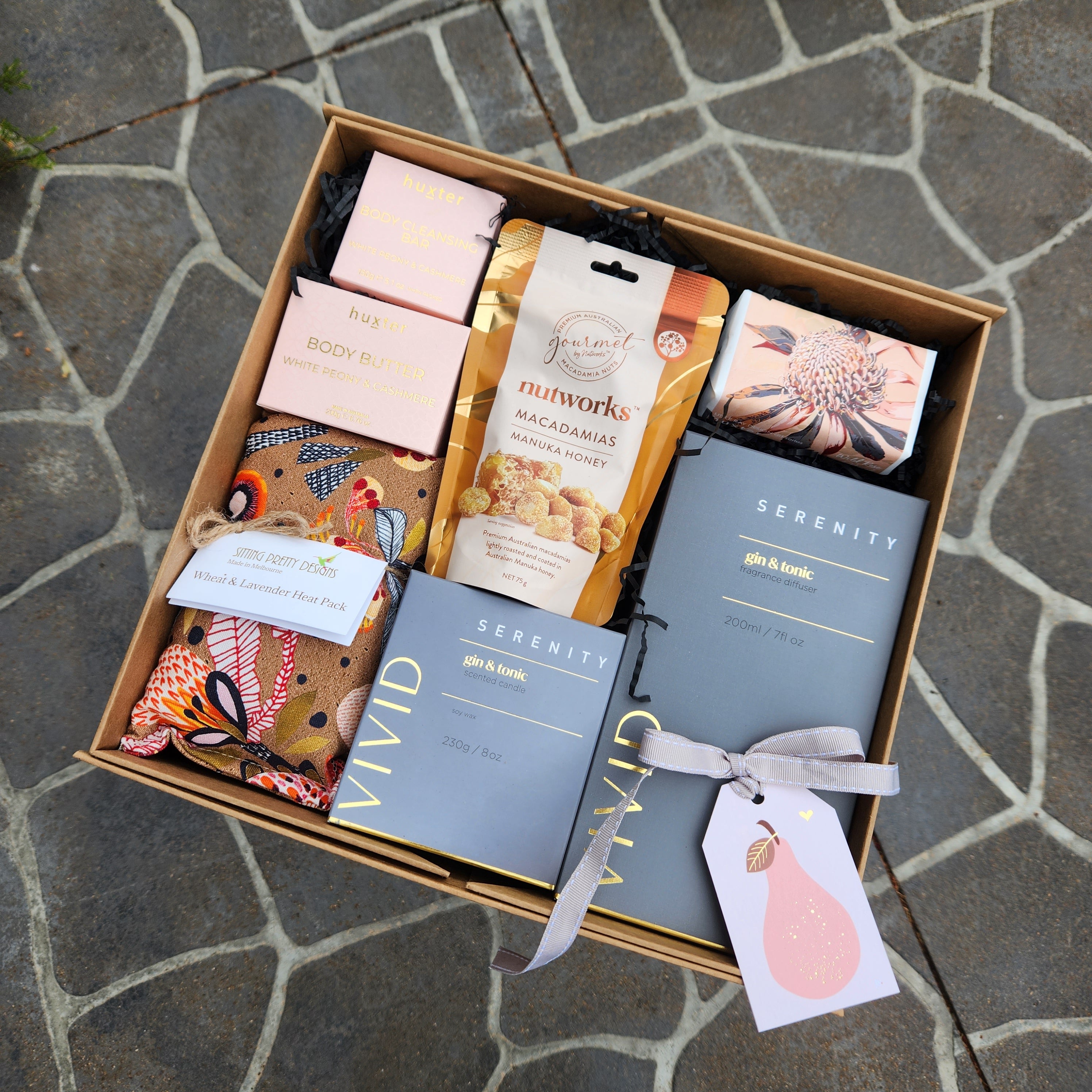 Contains Serenity VIVID Gin & Tonic Candle & Diffuser, Sitting Pretty handmade Wheat and Lavender Heat Pack, Huxter Wild Rose and Neroli Soap, boxed Huxter Peony & Cashmere Body Butter & Body Cleansing Bar & Nutworks Manuka Honey Macadamias.